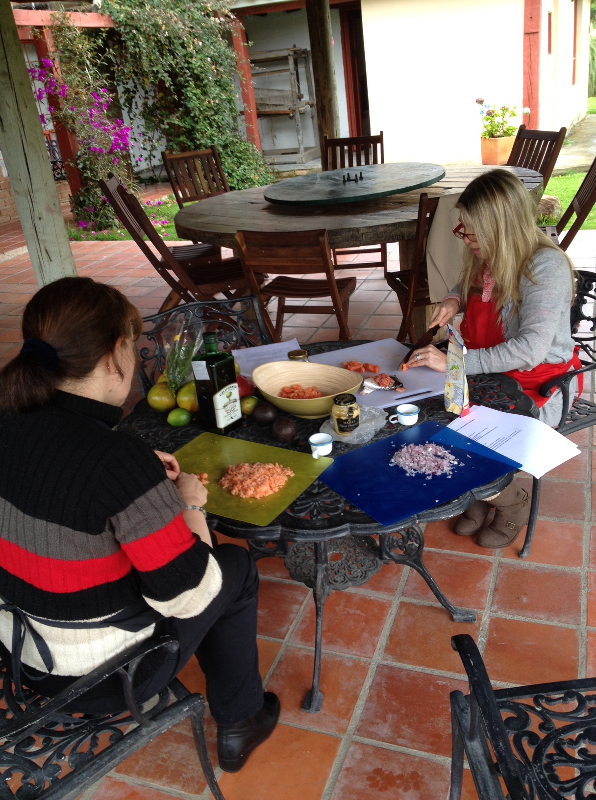 Los dos salmones los compró en Pacifica Sea Food, cra. 65 no 80-07; frutas y hortalizas en Clorofila y el resto en Carulla que fue de donde no llegaron los elementos que faltaban, un parmesano y un gajo de cebolla larga,. Fácil solución, Parmesano había en la casa y la cebolla larga la compramos de la huerta de una vecina.