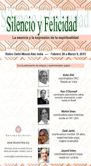 Por último anunció el El retiro en India «Silencio y Felicidad» que enseña y profundiza en la Meditación Raja Yoga, es un retiro conducido por yoguis antiguos y experimentados, en el ambiente más propicio para el aprendizaje y la experimentación. La primera parte del retiro se lleva a cabo en Delhi del 28 de febrero al 5 de marzo, luego se trasladan a Mount Abú para terminar el día 9.